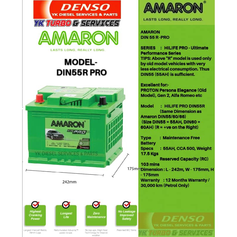 Amaron INSTALLATION 55B24L AMARON GO. Amaron Din55R Din55L Din55 Ln2 Hi-Life Pro Car Battery Bateri Kereta X50 Persona Gen2 Satria Vw Goft Naza. Boleh diharap piawaian Jerman Jenama terkemuka sejak 1887.